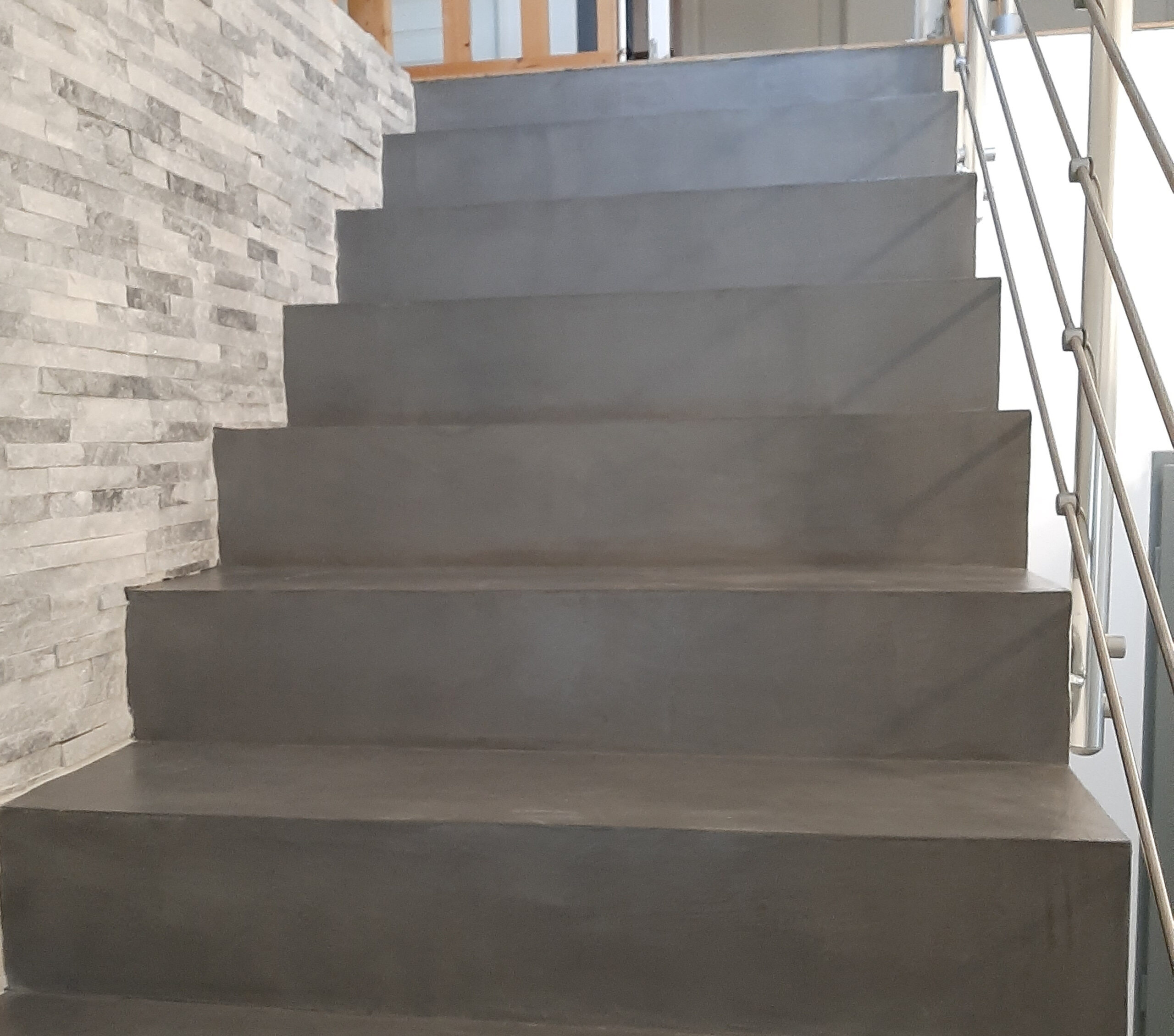 Après quelques étapes de travaux (ponçage, pose du revêtement béton ciré, bouche-pores et vernis) l’escalier était terminé et livré au client