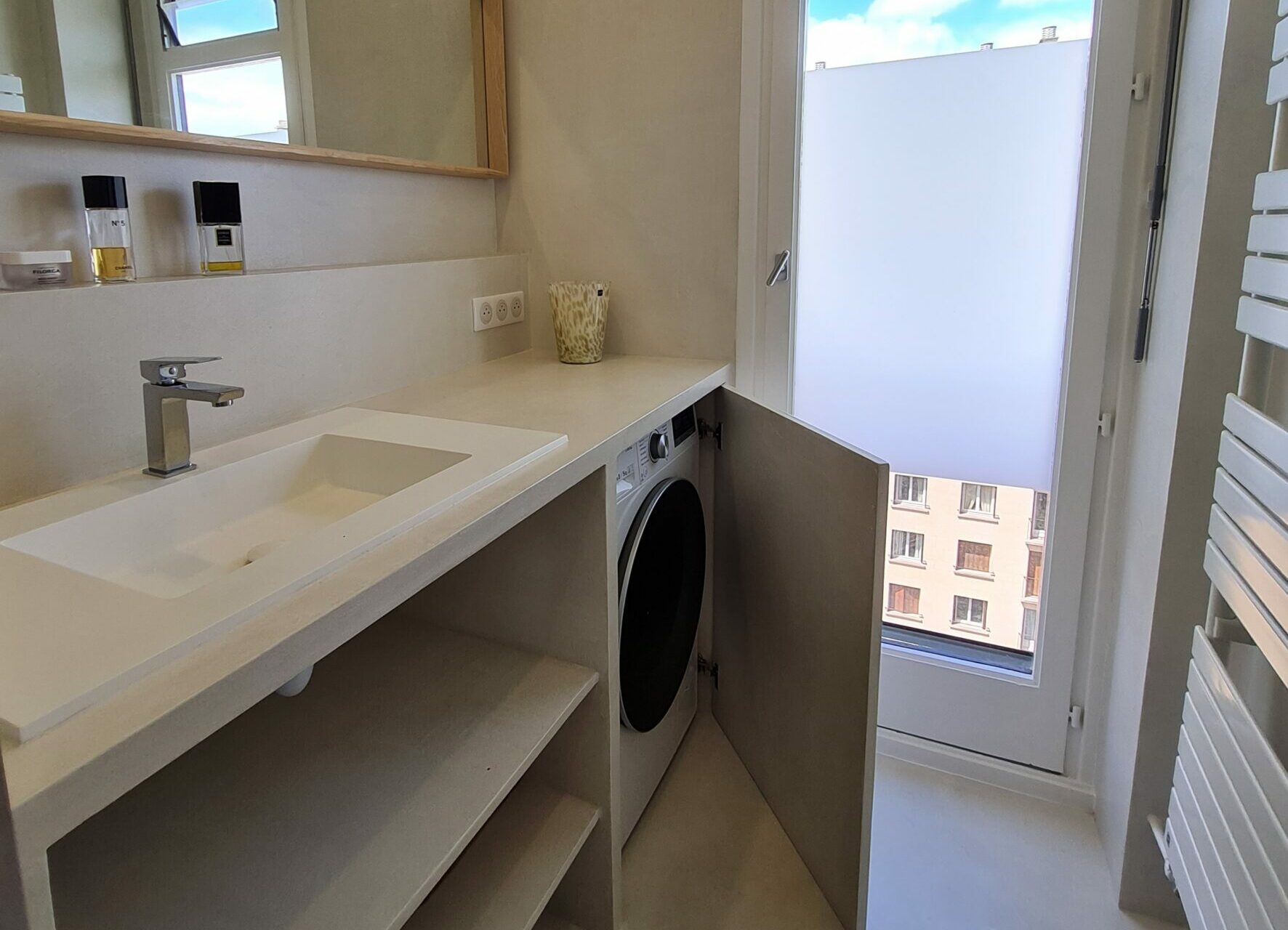 - réalisé un meuble vasque sur-mesure qui intègre le lave-linge derrière une porte.